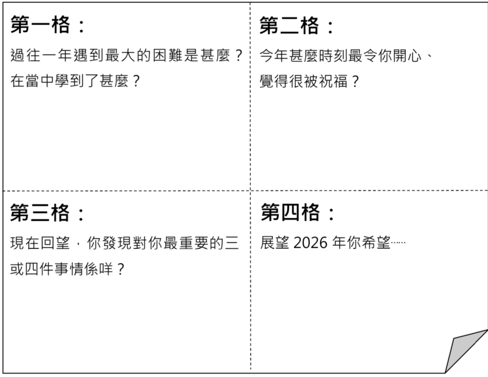 今年與青少年用了另一種類型的方法作回顧,更重要的是能夠與屬靈的伙伴們一齊分享與彼此禱告。以下這個練習送給大家,同樣鼓勵大家,回顧2025年後,可與知心好友一同分享和彼此禱告,一同見證神是活在我們當中,又真又活的神。